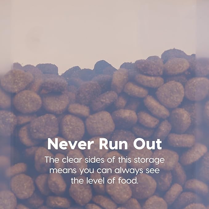 - CLEAR CONTAINER BODY: The translucent body allows you to check the food level in just one glance. Quickly check the remaining amount before you head to the pet store. Designed with a wide top and secure latch for easy opening, scooping and cleaning.
