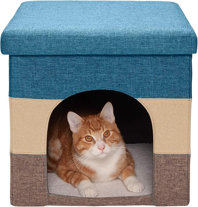 Furhaven Pet House for Indoor Cats & Small Dogs, Collapsible & Foldable w/ Plush Ball Toy - Living Room Footstool Cat Condo - Beach House Stripe (Brown/Blue), Small