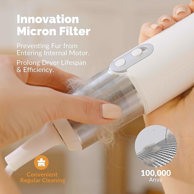 - [ Double Safety Guard & Easy Clean Dog Blow Dryer ] The internal parts of the hair dryer for dogs are waterproof nano-coating design and UL-certified overload power-off protection plug, providing safer pet grooming; built-in 100,000 array 20um metal filter and magnetic unlocking cover, convenient for regular cleaning.