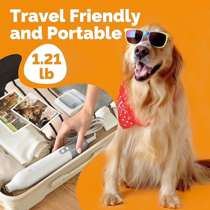 - [ Animal Friendly & Ergonomic Design Pet Dryer ] The JELLYFISH has undergone 5 years of research, millions of Humane and Cruelty-Free tests and adjustments to create this dog blower grooming dryer with low operating noise (40-75dB) and weight distribution in the center, Effectively reduce the burden of noise on the dog and user fatigue.