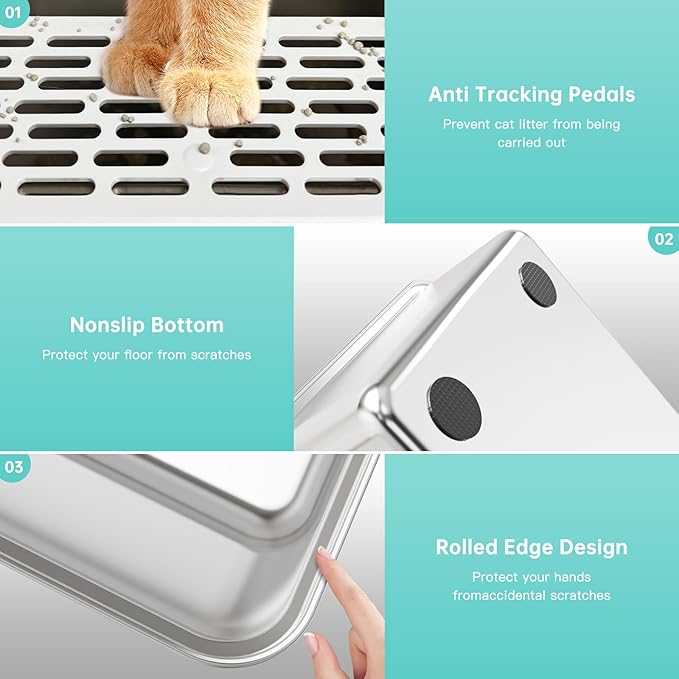 - 【UPGRADED BUCKLE DESIGN】The upgraded XL stainless steel Large cat litter box with high sided adopts buckle installation, designed to securely secure the outer enclosure and stainless steel cat litter box. Even if you have a naughty cat, you don't have to worry about the enclosure falling off frequently
