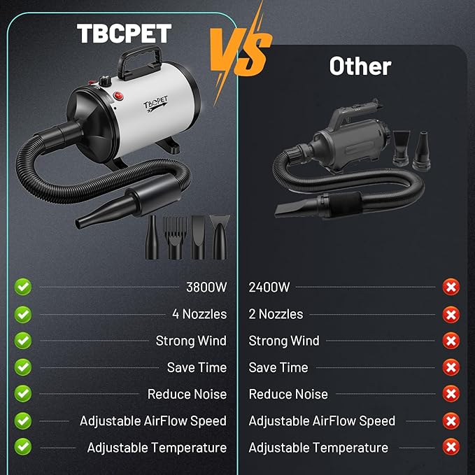 - [Versatile & Stable] Our pet hair dryer is designed for more than just grooming your pets; it is also great for drying your car, floors, and furniture. With a stable motor and adjustable speed and temperature settings, it offers ease of use and consistent performance.
