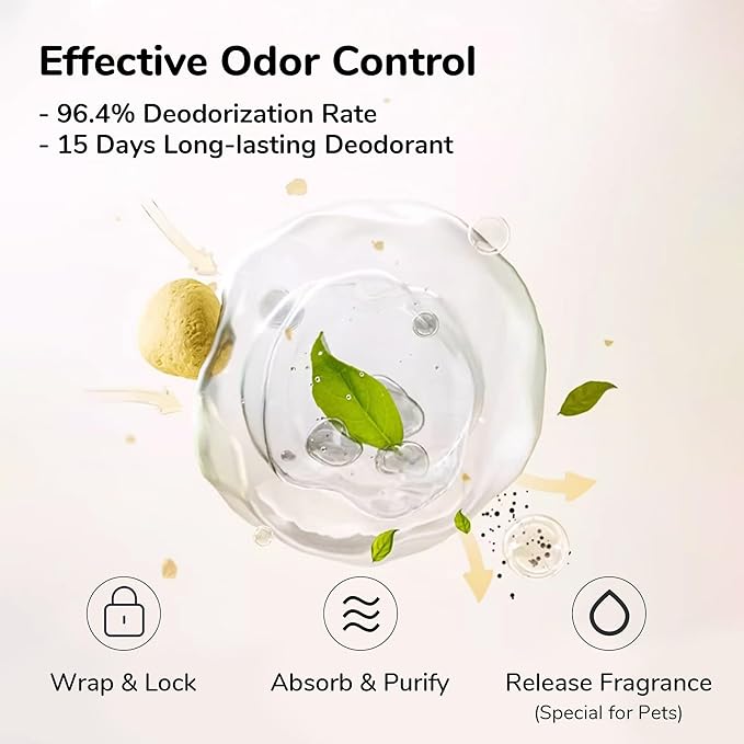 - Advanced Odor Control - Formulated with 2mm tofu fibers and bentonite, our clumping litter instantly locks in liquid and waste. Enhanced with activated carbon, it neutralizes odors with 96.4% effectiveness while the white tea fragrance maintains freshness for 15 days.