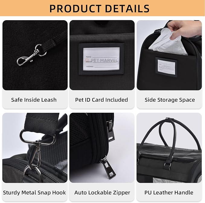- Thoughtful Features: PET MARVEL cat carriers have 4 mesh windows for ventilation and 3 wide doors that can be opened for easy access. An additional generous side storage pocket collects more stuff like water bottles, snacks and wipes. Equipped with a secure buckle to prevent your pet from escaping.
