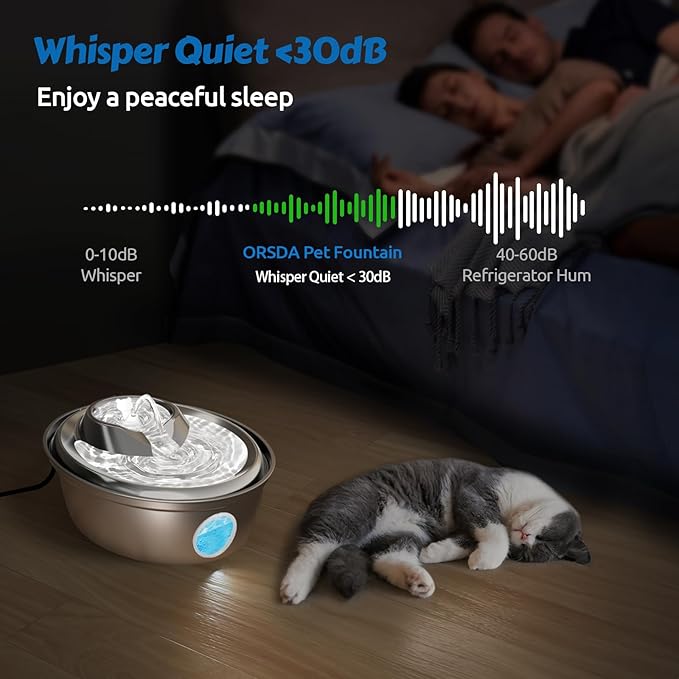 - 😽【Whisper-Quiet < 30dB】ORSDA D36 2L/67oz pet fountain with upgraded 1W low consumption pump and slope water flow structure, allowing the fountain to operate quiet than 30dB, help you and pets sleep soundly.
