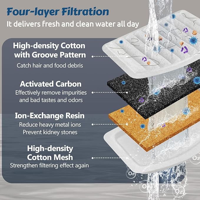 - Dual Filtration System: ORSDA cat fountain filters employ a 4-layer system, including activated carbon, ion resin, and high-density cotton mesh, effectively removing impurities and odors, ensuring fresh and clean water 24/7.