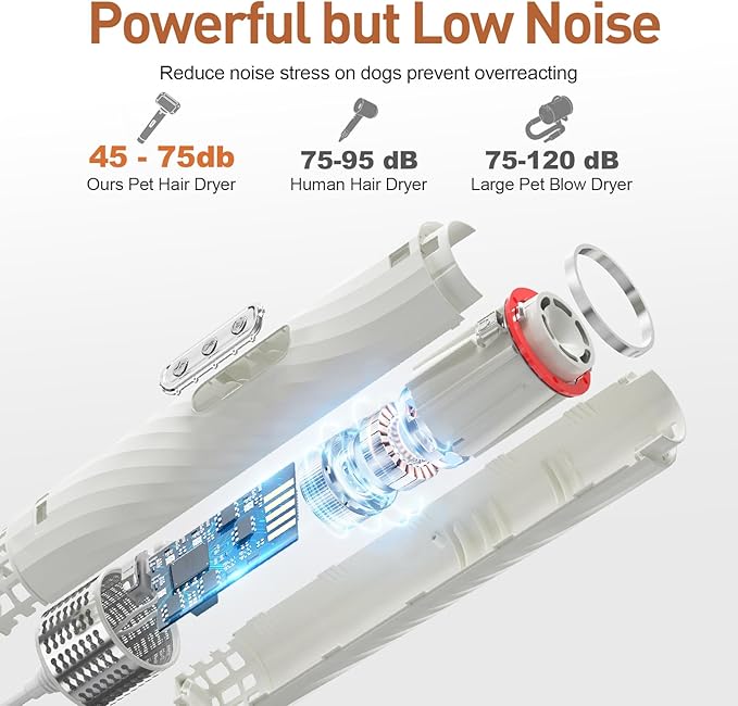 - Dog Dryers for Grooming & 4 Multi Nozzles: The dog grooming dryer kit comes with 4 different nozzles which are standard nozzle, styling nozzle, wide tooth comb nozzle and slicker brush nozzle for different purpose. Four different nozzles suited to different fur types and parts of your pup’s body.