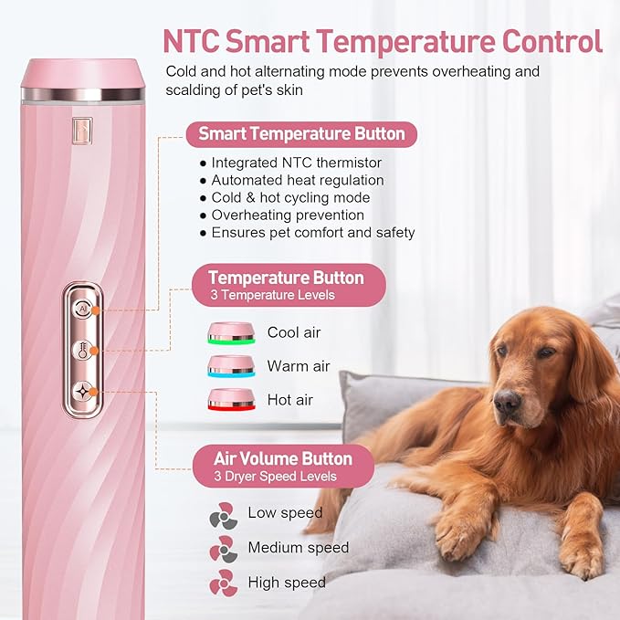 - Adjustable Temperature and Air Volume: The pet hair dryer has Three-stage temperature adjustment, including cool air, warm air, and hot air.Three-speed wind adjustment, including low, medium, and high-speed modes. Adjustable speed and heat settings for versatile grooming