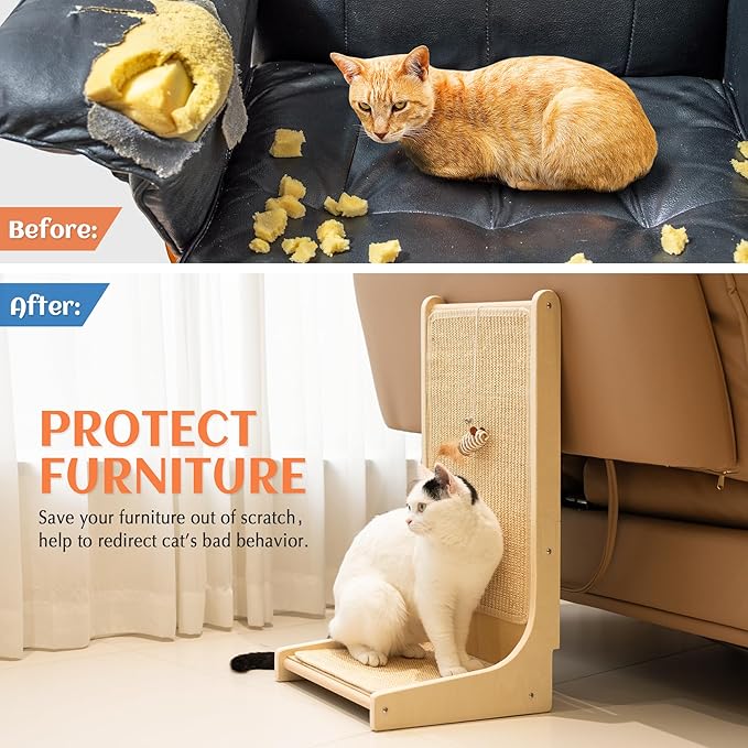 - L-SHAPE SCRATCHER: Easy to set the floor-standing scratcher anywhere as you like. Tease your cats with the feathered mouse toy.
