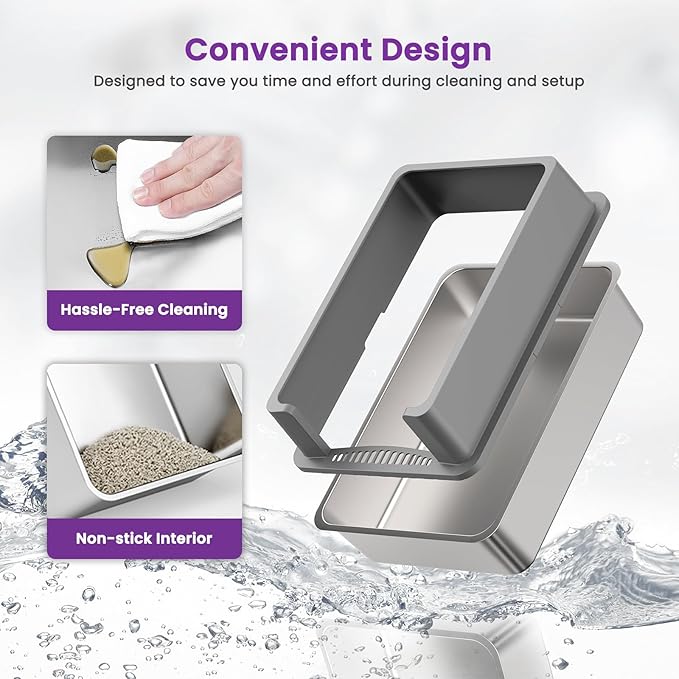 - 【Includes Scoop & Non-Slip Pads】This stainless steel litter box XXXL comes with a litter scoop and four non-slip pads, keeping the box stable and your floor protected. Everything you need for a cleaner litter area.