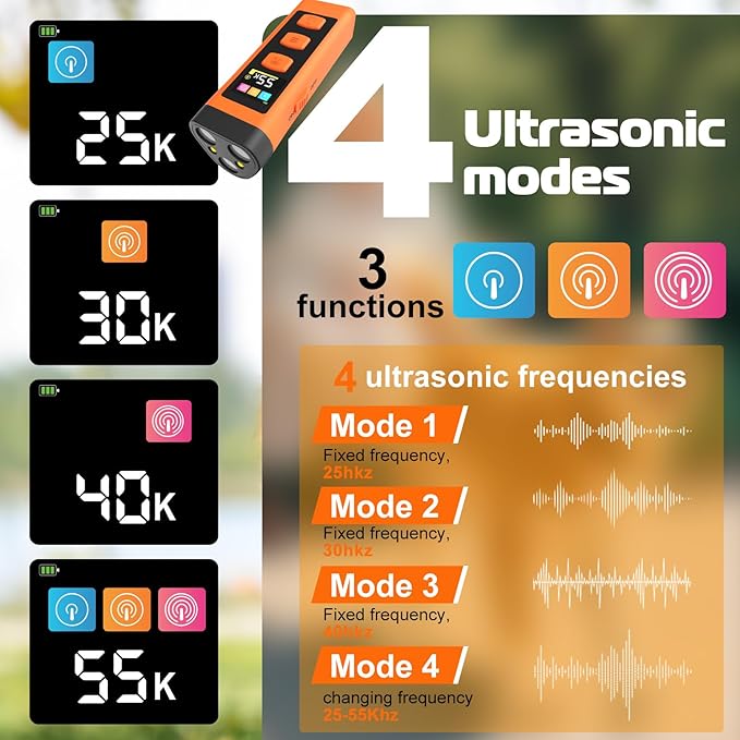 - 【Smart Triple-Mode Adjustable System】:Featuring LED light, ultrasonic, and sound modes, this device offers customizable training with 4 ultrasonic intensity levels and 5 sound frequencies (25kHz-55kHz). The clear LED display shows active modes and battery status for easy use, while the 8-second auto-stop ensures safe, controlled sessions every time.
