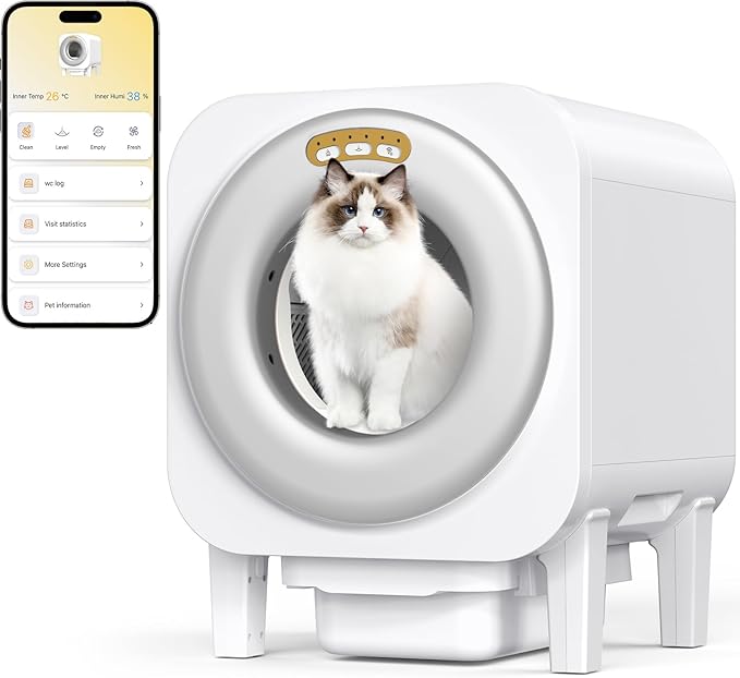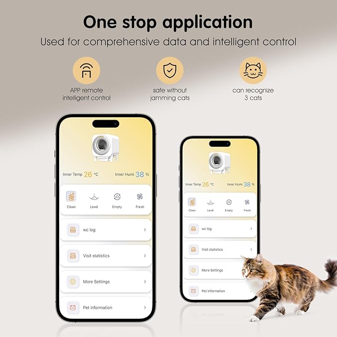 - REMOTE INTELLIGENT CONTROL VIA APP: The smart cat litter box with mobile application connection function offers 24-hour video monitoring, allowing real-time voice interaction with cats from a distance. It can recognize up to three cats and monitor usage statistics such as temperature, humidity, and toilet conditions in real time.