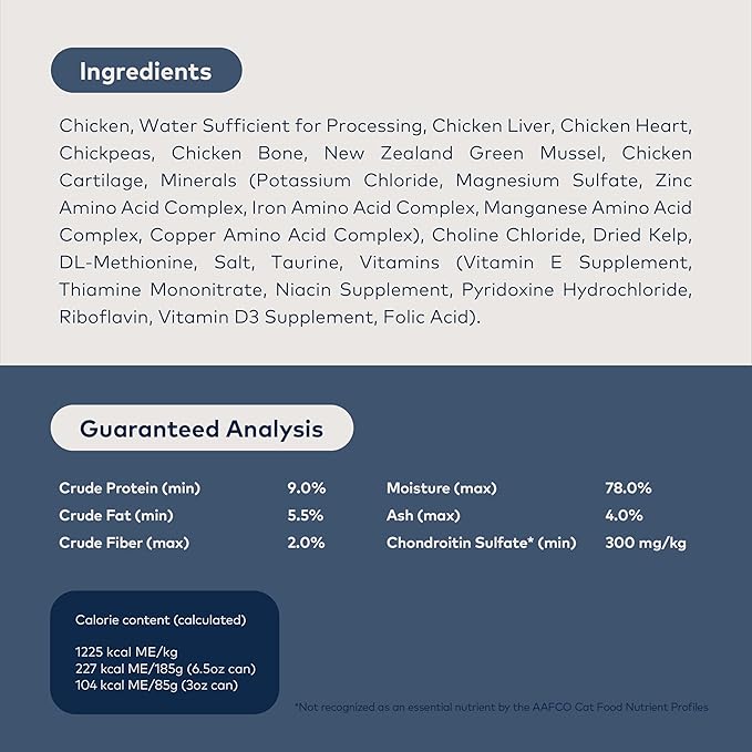 - HIGH PROTEIN, NUTRIENT DENSE, MOISTURE RICH: Featuring free-range Chicken, Organs, Bone, and New Zealand Green Mussels, this grain-free pate style cat food delivers premium nutrition with a mouth-watering taste for all cats and life stages. This moisture rich, chunky-loaf canned cat food uniquely support cat hydration.