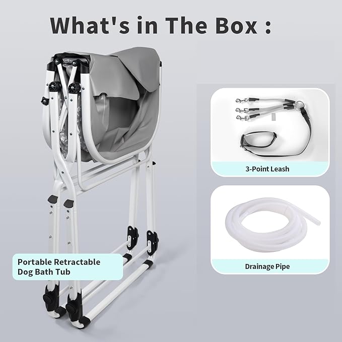 - Premium Safety Upgrades for Dog Bathtub: Adjustable safety tether (prevents jumping), quick-drain hose attachment, plus side storage pockets for shampoos & tools - making this the safest dog washing tub for anxious pets.
