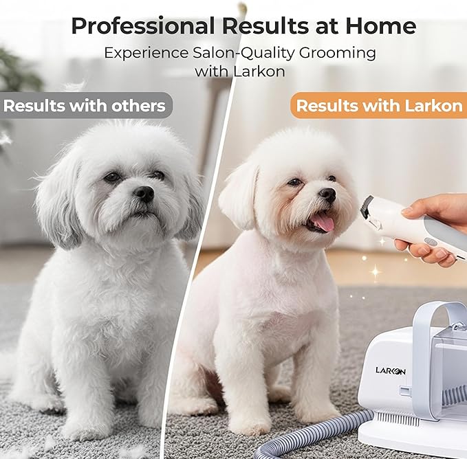 - Complete Grooming Kit for Happy Pets: Give your furry friend a spa day at home with the Larkon Dog Grooming Vacuum Kit. It includes everything you need — a clipper, nail grinder, deshedding brush, slicker brush, curry brush, and crevice tool — all in one easy-to-use system.