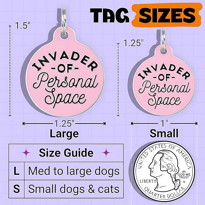 - If your dog knows no boundaries let them tell it like it is with this funny pet tag. Featuring the saying "Invader Of Personal Space" it's gonna bring a laugh and smile!