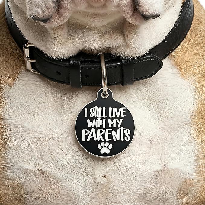 - Keep it classy and sassy with our pet ID tag that says "I Still Live With My Parents" on one side and your pup’s ID on the other. Perfect for the pampered pooch who doesn’t do ordinary!