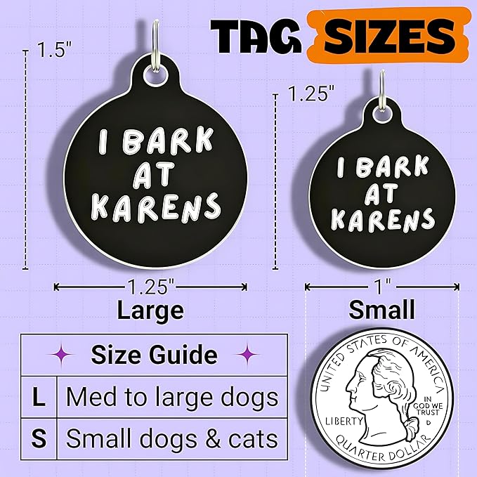 - Keep it classy and sassy with our pet ID tag that says "I Bark At Karens" on one side and your pup’s ID on the other. Perfect for the pampered pooch who doesn’t do ordinary!