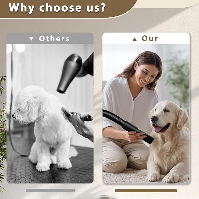 - Low noise and pet friendly: Advanced noise reduction technology keeps the noise level at ≤50dB, reducing pet stress. This dog hair dryer ensures a quieter drying process. Start at a lower speed and gradually increase the speed to help your pet adjust. Pet hair dryer provides a smoother, more comfortable grooming experience