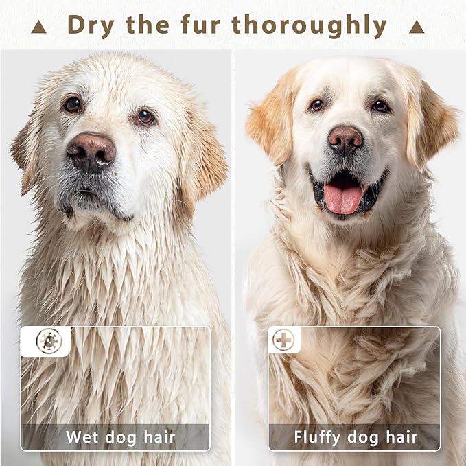 - Fast, safe and time-saving: This dog hair dryer is equipped with a 3800W/5.2HP motor and has an airflow of up to 75m/s, reducing drying time by 70%. Adjustable heat from 85-130℉ ensures even and safe drying. Built-in overheat protection makes this pet hair dryer reliable for home and professional use