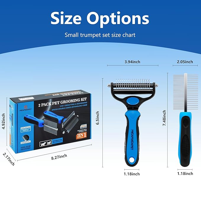 - Deshedding Brush and Comb Set: The set includes a 2-in-1 design de-shedding and shedding brush and a wide-toothed and dense-toothed double-sided comb, suitable for horses, long-haired dogs, and all kinds of short-haired cats, dogs, rabbits, and other pets' hair grooming. It better satisfies your needs without having to buy separately, offering an effective combination for de-shedding and smoothing