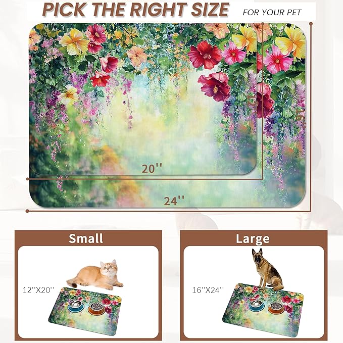 - Absorbent: This Abstract Spring Flowers Blossom Ivy Colorful pattern pet food mat helps prevent liquid spills and keeps your pet's eating area clean, making it a practical addition to your pet supplies. It helps keep paws dry even for pets who love to drink water. The sturdy design is resistant to tearing and helps prevent accidental ingestion.