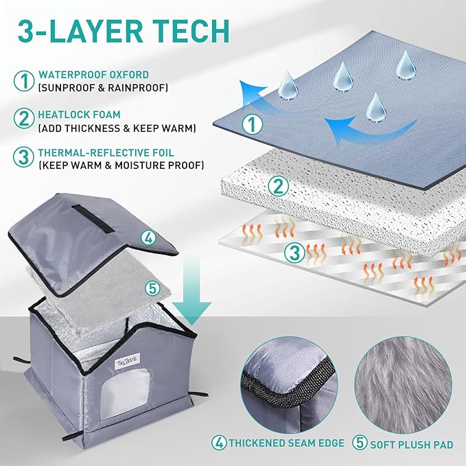 - All-Season Insulation – Triple-layer construction with polyethylene foam& foil core traps body heat, creating a warm insulated cat house outdoor for cats in temperatures down to 20°F. Ideal for year-round outdoor use. for outdoor cats year-round