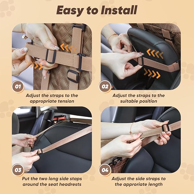 - Triple Safety Protection: Center console dog car seat is equipped with two adjustable safety belts that can be fixed on the driver's and passenger's seats. The bottom has four elastic straps, which can be attached horizontally or vertically to accommodate different car models, and to make sure the dog armrest booster seat install the middle console closely. The interior of the car seat for dogs has a safety leash that can be attached to a pet collar, chest strap or carrier to keep your pet safe.