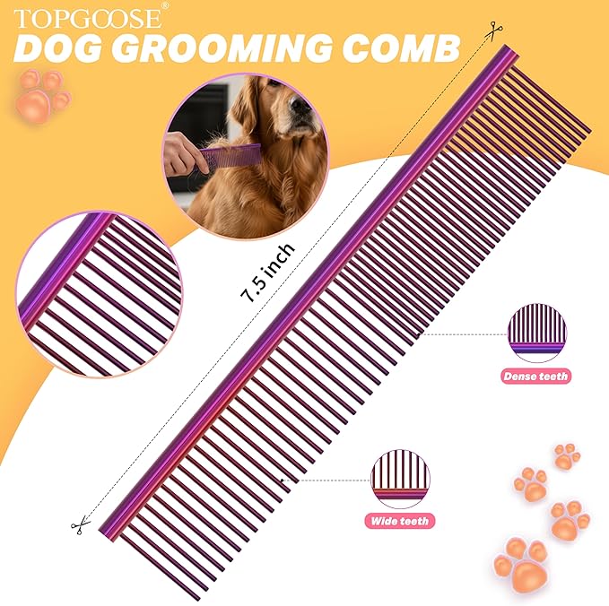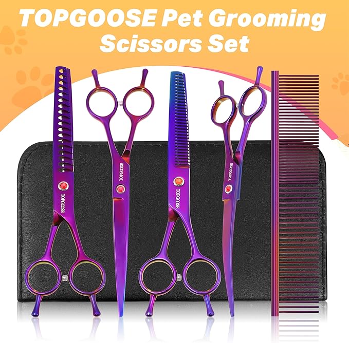 TOPGOOSE Dog Grooming Scissors Kit, Professional 6 in 1 Pet Scissors Sharp Shears Set - Straight, Thinning, Chunker, Curved Shears and Comb for Long Short Hair for Dog Cat (Set, Purple)