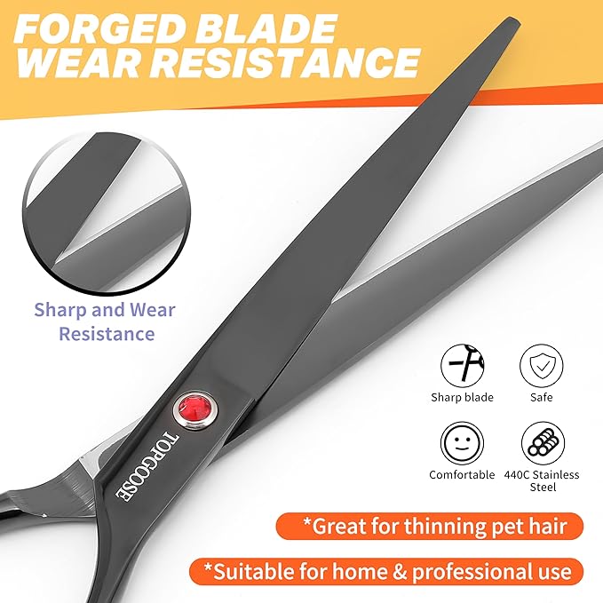 - ✔【Premium Steel】Our dog grooming scissors are crafted from premium quality Japanese 440C stainless steel, manually forged by professional steel workers with more than 10-year experience, ensuring blades always sharp for smoothly trimming that won't damage your pet's coat.