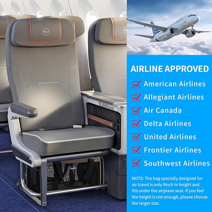 - 【CHECK SIZE BEFORE BUYING】In order to fit the under-seat dimensions of airlines, this cat carrier can only fit small dogs and cats. We recommend that the pet size you carry be within 15"L x 8"W x 9"H(this carrer's inner size), please choose the pet carrier reference your pet's length and height. Reference pet weight: dog weight under 9LBS and cat weight under 13LBS.