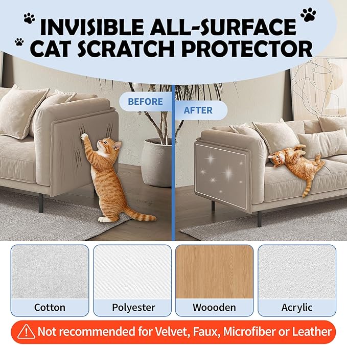 - 【Invisible & Versatile】This cat scratching furniture protector defends your furniture without being seen. This cat furniture protector seamlessly blends into various surfaces like wood, fabric, and upholstery, preserving your decor. (Not for use on real or faux leather.)