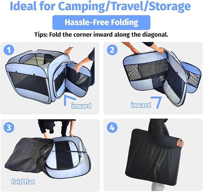 - ใ๐ฃ๐ผ๐ฝ-๐๐ฝ & ๐ฃ๐ผ๐ฟ๐๐ฎ๐ฏ๐น๐ฒใOur pop up dog playpen pet tent can be unfold or fold flat in seconds without any assembly of metal parts. Lightweight and Strong. Quickly make a secure and cozy lounge for your pets.