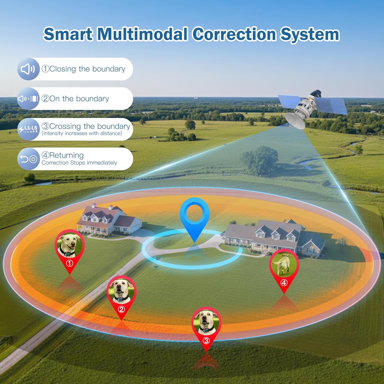 Beep โ vibration โ static (1โ9 levels) โ progressive, gentle boundary training